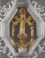 Si tratta di un minuscolo Calvario con decorazioni trilobate alle estremità della croce e volute che si diramano dalla base secondo una tipologia bizantineggiante diffusa in età gotica soprattutto in Francia.